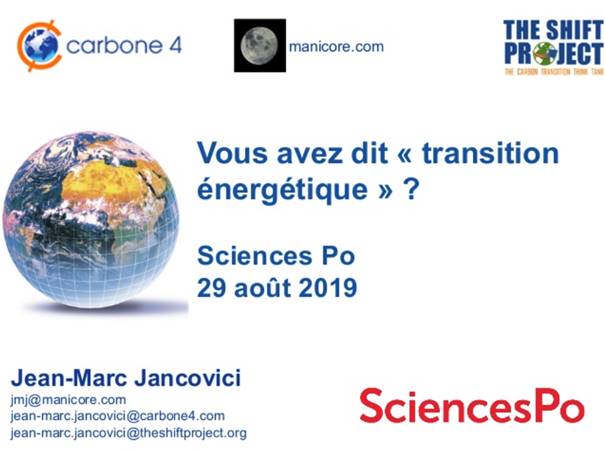 Alors normalement, vous devriez passer sans encombre à travers ce que je vais vous raconter ce matin. D'abord parce que vous rentrez de vacances et vous avez passé des nuits normales ensuite vous êtes jeunes et vous connaissez probablement cette définition de la jeunesse "on est jeune tant qu'on se croit éternel et invincible", et donc tant qu'on est éternel et invincible n'importe quel problème dont on peut vous parler, c'est "même pas peur"! donc normalement c'est même pas peur. Qui dans cette salle n'a jamais entendu parler de transition énergétique? [Blanc]