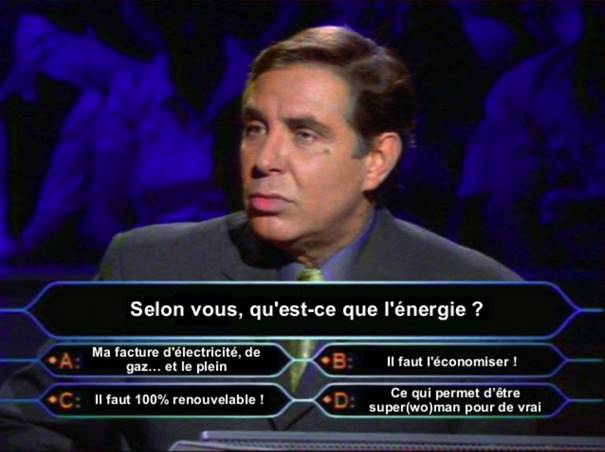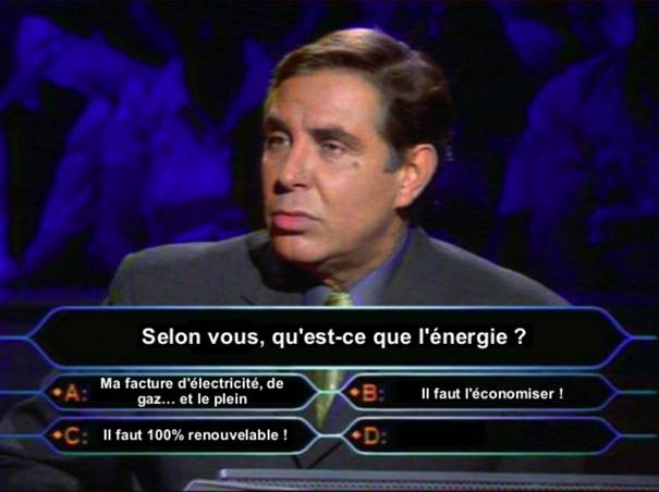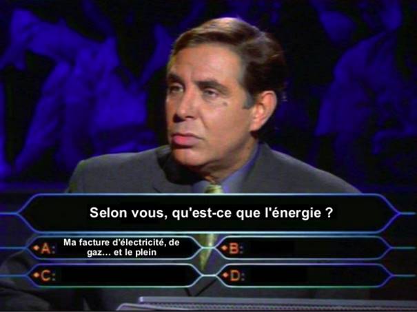 Si je vous pose la question non pas qui est capable de me définir ce que c'est que l'énergie oui mais à votre avis c'est quoi l'énergie, alors je ne vous pose pas la question juste à vous, je pose la question à la population française dans son ensemble.