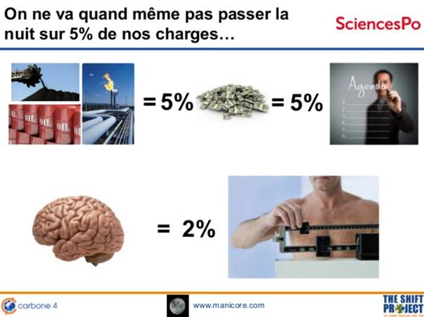Si je vous le dis autrement, le chiffre d'affaire des acteurs énergétiques dans le PIB mondial, c'est quelques pourcents du PIB. D'accord? La valeur du pétrole qu'on achète tous les ans, par exemple, sur les marchés c'est 3% du PIB mondial. D'accord? Donc si je regarde ce que vaut l'énergie en termes de facture c'est quelques pourcents de nos dépenses et à ce moment homo-économicus-rationalus va se dire si c'est quelques pourcents de mes dépenses je vais y passer quelques pourcents du temps fermer le banc le reste du temps je m'occupe de choses sérieuses. Et c'est très exactement comme ça que raisonnent la quasi-totalité du monde, des décideurs, économiques, politiques et des hauts fonctionnaires. C'est une facture, quelques pourcents de ce qu'on dépense, on s'en occupe quelques pourcents du temps, etc. Alors malheureusement ce raisonnement est à peu près aussi pertinent que si je vous dis votre cervelle c'est 2% de votre poids, et soit dit en passant chez les hommes la testostérone c'est beaucoup moins que 2% du poids, donc vous pouvez vous en occuper 2% du temps et puis le reste du temps ce n'est pas la peine. D'accord? Il est absolument évident que si je vous enlève la moitié de votre cervelle vous allez avoir quelques petits problèmes dans la vie.