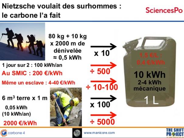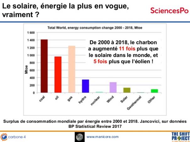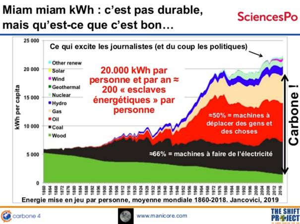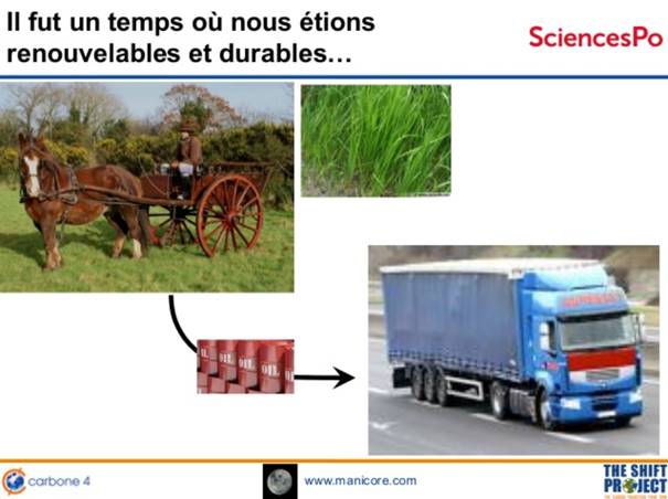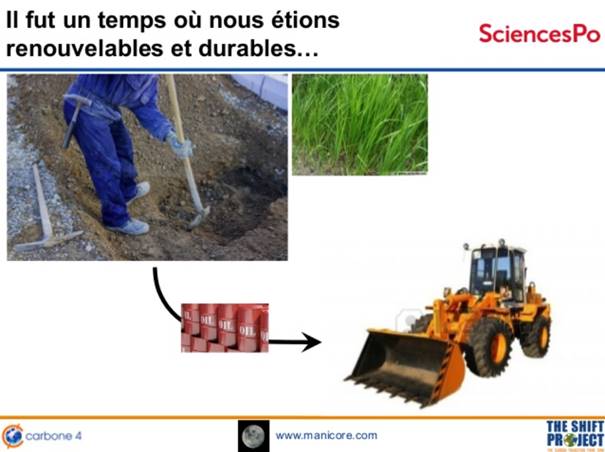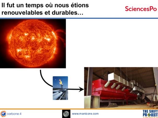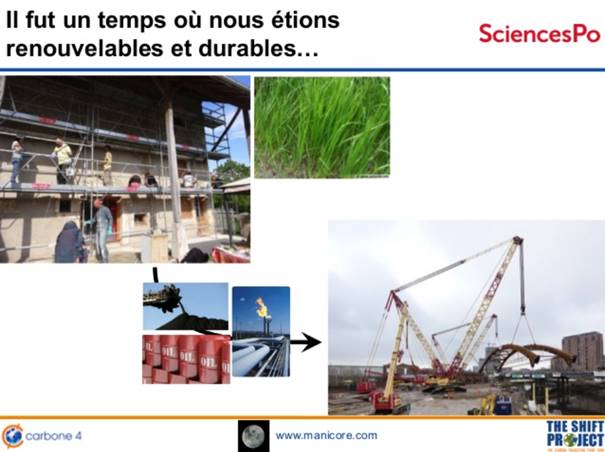 Donc, ça fait deux siècles, que nous passons notre temps à passer des énergies renouvelables aux énergies fossiles. Alors, de deux choses l'une, ou bien on est des crétins patentés, ce qui est possible après tout, il y a un certain nombre de philosophes qui le disent, ou bien c'est que il y a une raison physique profonde au fait qu'on est fait ça pendant deux siècles, et c'est ce que je vais vous essayer de vous expliquer à partir de maintenant, il y a une raison physique profonde à ce qu'on ait fait ça, et donc, ça ne va pas du tout être "a piece of cake" comme disent les anglais, de passer à 100% ENR en conservant le pouvoir d'achat qu'on a aujourd'hui et les études longues qui vous permettent d'étudier ici.