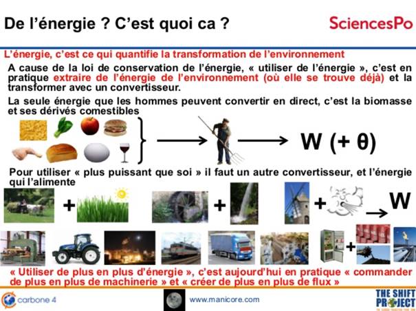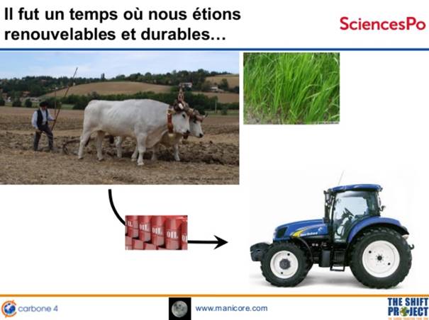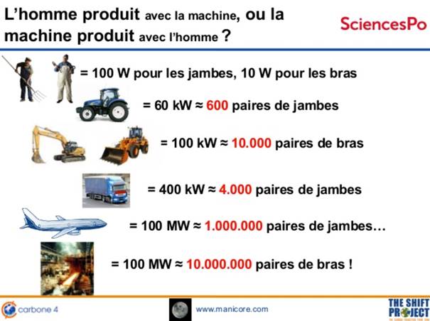 Et si chez les hommes j'enlève la totalité ou chez les femmes la totalité des œstrogènes, je vais un tout petit peu modifier ce qui vous arrive alors que j'ai touché à quelque chose qui représente une infime fraction de votre masse. D'accord? Donc ce que représente l'énergie en part de nos dépenses, ce n'est pas le sujet, parce que vous allez vous rendre compte que la totalité de ce qui fait le monde moderne en dépend. Et ces raisonnements économiques en parts de camembert, masquent le lien de dépendance d'une part de camembert à une autre part de camembert. Il y a une autre ânerie qu'on cite couramment qui est, l'agriculture c'est 2% du PIB donc si on s'en passe ce n'est pas très grave. Sauf que si vous arrêtez de manger, les 98% restants du PIB vous pouvez les oublier aussi. Donc les raisonnements en parts de camembert, faites très, très attention, il y a une illusion extrêmement courante dans ce genre de raisonnement,