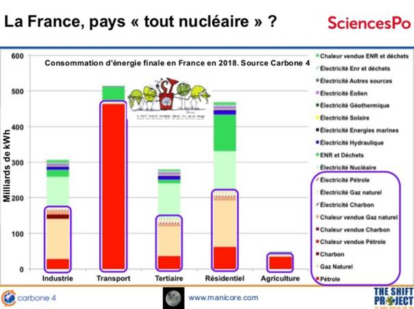 Et vous voyez que les nouvelles énergies renouvelables en violet, là, ne sont toujours pas en mesure de compenser le nucléaire en valeur absolue qui est juste en-dessous, plus le gaz, plus le pétrole, plus le charbon qui sont également juste en-dessous.