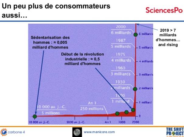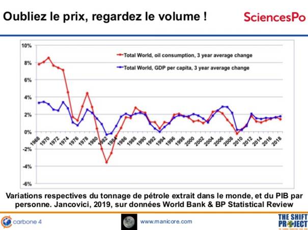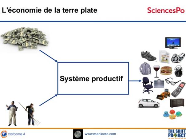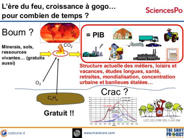 Alors, cette production croissante, voilà, on lui donne une contrepartie économique qui s'appelle le PIB, et donc il y a deux facteurs limitants au moins à cette affaire-là, qui sont, un, que vous connaissez très bien qui est, ça provoque un changement climatique cette affaire-là est-ce que ça va pas finir par être désagréable cette expérience, et un deuxième facteur limitant dont les journaux français ne parlement quasiment jamais, qui est le facteur limitant à l'amont, à savoir est-ce que j'ai assez d'énergie qui rentre dans le système pour lui permettre de continuer à croître.