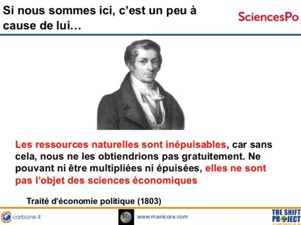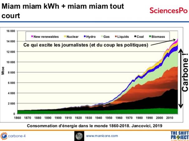 Et on m'explique que la neutralité va augmenter le PIB. Evidemment que non. La neutralité qui est physiquement possible, c'est une énorme contraction du PIB. Ça ne veut pas dire qu'elle n'est pas souhaitable. Vous allez voir après les petits désagréments qui nous attendent avec le changement climatique. Mais j'insiste, ça ne se fera pas à PIB croissant. C'est physiquement impossible. Parce que justement ça fait deux siècles ou trois siècles qu'on fait l'exact inverse, qu'on augmente l'énergie en tapant dans les stocks qui sont supérieurs aux énergies renouvelables.
