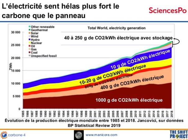 40:59 [Diapositive intitulée "L'électricité sent hélas plus fort le carbone que le panneau"]