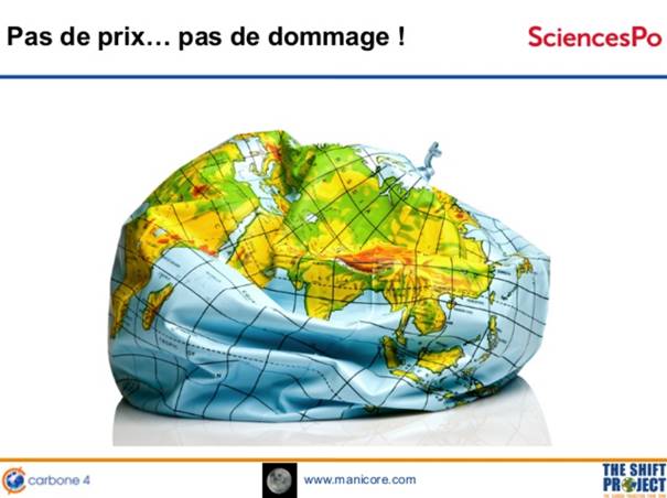 Donc l'histoire que je vous ai racontée, c'est ça, on a des stocks de pétrole sous terre, c'est gratuit, il y a des stocks de charbon et des stocks de gaz, on a aussi des stocks de minerais, etc., tout ça c'est gratuit. Alors utiliser du pétrole c'est le brûler, le brûler c'est l'oxyder, l'oxyder c'est une réaction chimique exothermique qui vous fait du CO2, c'est inexorable. D'accord? Vous ne savez pas oxyder du carbone autrement qu'en faisant du C02. Et ça, ça ne changera pas d'ici à votre mort.