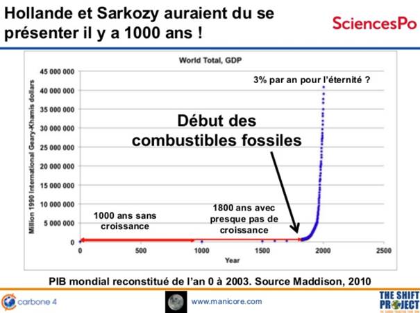Jusqu'en 1850, c'est-à-dire la révolution industrielle, voyez, il y a une croissance, mais enfin il faut la regarder avec une loupe, le premier pays où ça décolle vraiment, c'est l'Angleterre, parce que l'Angleterre commence à taper dans son charbon, et le charbon c'est les machines! Et puis arrive le début des combustibles fossiles et alors là c'est "Rhââ Lovely", vous avez l'invention par les économistes de la croissance structurelle de long terme.