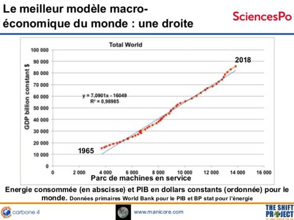 Alors voilà le meilleur modèle macro-économique que j'ai trouvé à ce jour, ça s'appelle une droite. La droite elle vous dit "regarde combien d'énergie tu utilises sur Terre c'est-à-dire combien de machines tu mets en mouvement, et moi je te dirai quel est le PIB mondial".