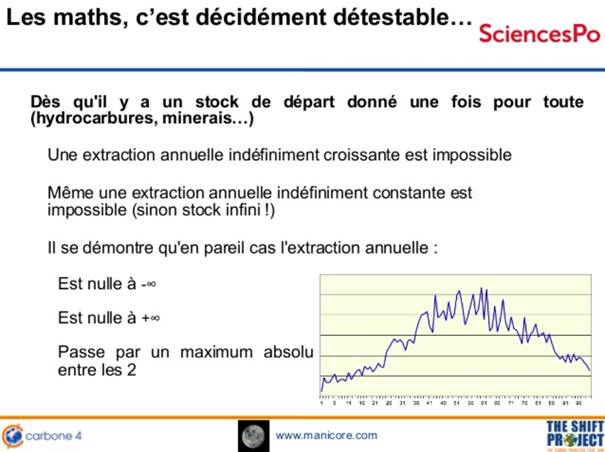 A partir du moment où vous tapez dans un stock de départ qui est donné une fois pour toutes, les mathématiques vous interdisent que vous puissiez avoir une production indéfiniment croissante, on est d'accord? Sinon ça veut dire que le stock est infini. C'est même interdit d'avoir une production indéfiniment constante parce que sinon le stock est toujours infini. Tout ce que vous avez le droit d'avoir, c'est une production qui part de zéro à moins l'infini, et qui finit à zéro à plus l'infini et qui passe par un maximum entre les deux. C'est un théorème de maths, je sais même encore le démontrer. Alors ce que je vous dis, ça vaut pour le pétrole, mais ça vaut pour le gaz, ça vaut pour le minerai de cuivre, ça vaut pour le minerai de, le minerai d'aluminium, ça vaut pour le tungstène, le cobalt, le nickel, le zirconium, le lithium, le "just name it", ça vaut pour n'importe quelle ressource dont le stock de départ sous terre est disponible en quantité donnée une fois pour toutes.