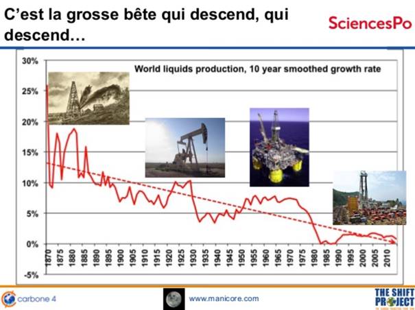 Eh bien, vous voyez que cette variation, le pétrole augmentait de 15% par an il y a un siècle et demi, il augmentait de 10% par an avec des moyens plus sophistiqués soit dit en passant, après il augmentait de 5% par an il y a quelques dizaines d'années avec des moyens encore plus sophistiqués, et aujourd'hui avec le "shale oil" il n'augmente plus que d'un peu plus de 0% par an.