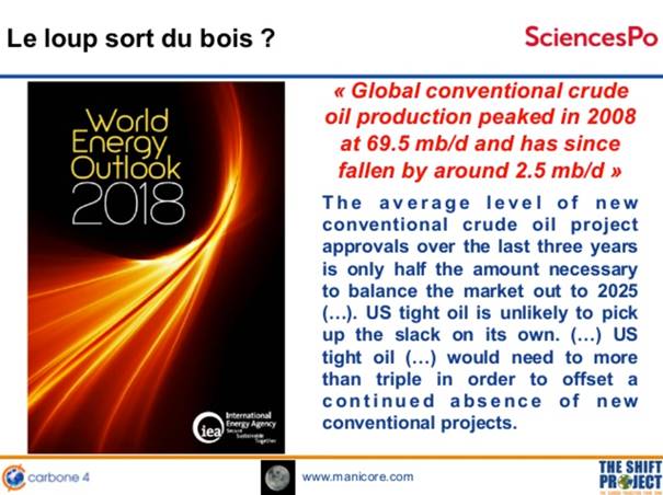 L'agence internationale de l'énergie, alors la presse a totalement passé ça sous silence, totalement, a sorti en décembre 2018 un rapport disant, pour la partie conventionnelle du pétrole c'est-à-dire ce qui n'est pas "shale oil", le pétrole de roche-mère, et ce qui n'est pas les sables bitumineux du Canada, tout le reste a passé son pic en 2008. Et depuis, ça décline. Qui en a entendu parler de ce truc-là? A part les lecteurs d'Auzanneau. Bon. Je peux vous dire que c'est autrement plus important pour votre avenir qu'une bonne partie des choses dont vous avez entendu parler dans la presse, sinon la quasi-totalité de ce dont vous avez entendu parler dans la presse.