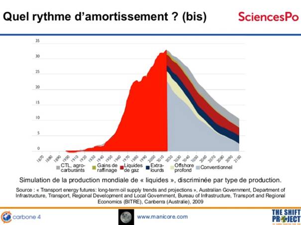 Alors voilà où en est en gros sur l'extraction mondiale du pétrole, sachant que dans le pétrole, il y a aussi le non-conventionnel et donc ça veut dire que les pétroliers que je connais disent depuis longtemps, le sommet de la production mondiale de pétrole tout confondu, y compris avec le "shale oil" etc., c'est 2020 plus ou moins 5 ans, et plus ou moins 5 millions de barils jour. Voilà, donc 2020 c'est l'année prochaine, je dis bien plus ou moins 5 ans, ça veut dire qu'avant la fin de vos études vraisemblablement, et très certainement avant que vous ayez mon âge, ça c'est absolument certain, eh bien vous verrez l'approvisionnement mondial, sachant que l'européen a déjà commencé à baisser, l'approvisionnement mondial en pétrole se contracter.