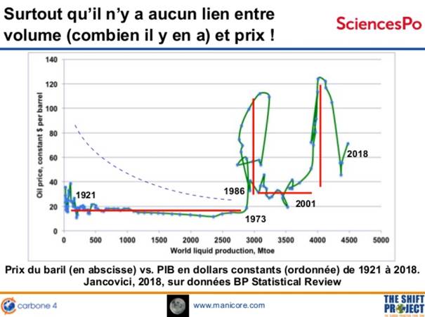 Alors évidemment c'est une blague! Il n'y a pas d'élasticité! Et il n'y en a pas non pas parce que ça me plaît, parce que vous regardez cette courbe et il n'y a pas élasticité. L'élasticité de long terme prix/volume sur le pétrole et sur l'énergie en général n'existe pas. Donc ce n'est pas la peine de regarder les prix pour savoir si ça sera rare demain. Ça ne marche pas! Et en fait, alors je n'ai pas le temps de vous faire la théorie aujourd'hui, mais vous pouvez très simplement expliquer, il faut juste trois minutes et l'heure commence à tourner, vous pouvez très simplement expliquer pourquoi c'est structurellement impossible que vous n'ayez pas d'élasticité et les deux indicateurs sont les suivants, c'est que pour avoir beaucoup de pétrole, il faut aller chercher des pétroles compliqués donc ça fait monter le prix du baril, sauf que si vous faites monter le prix du baril vous découragez la demande et donc vous avez moins de demande et donc vous allez chercher moins de pétrole.