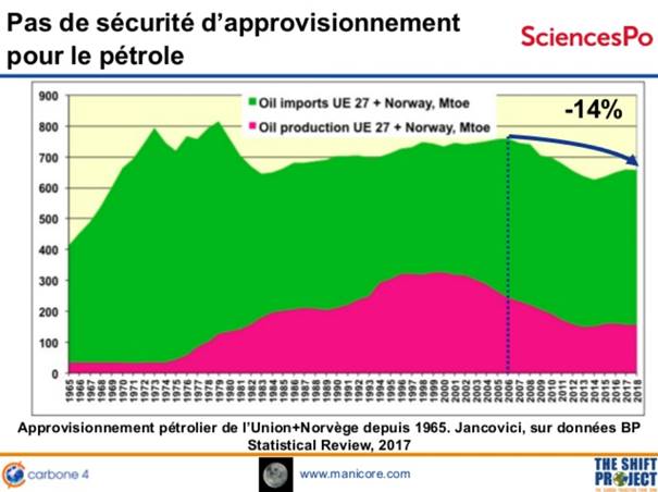 Et donc la quantité de pétrole qui rentre en Europe a perdu 14% depuis 2006. Qui en avait entendu parler? Qui pense qu'il y a une autre raison au fait que les émissions de CO2 des transports en Europe aient baissé? Est-ce que c'est parce qu'on a des politiques intelligentes? Pas du tout! On a des politiques qui continuent à être parfaitement connes, on vend de plus en plus de SUV, on continue à faire des autoroutes, des aéroports, on va mettre une nouvelle piste à Roissy, non, non, on a des politiques qui continuent à être parfaitement connes, juste on émet moins de CO2 parce qu'il y a moins de pétrole à cramer. Point barre. Point barre! D'accord?