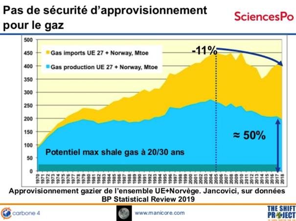 Ce qui veut dire qu'en Europe, quand la mer du Nord est passée par son pic de production en 2005, qui en avait entendu parler? [Blanc] Personne! Eh bien l'approvisionnement gazier européen est passé par un pic. Donc même les anti-nucléaires qui rêvent de remplacer le nucléaire par du gaz, ils ne le remplaceront pas par du gaz, il n'y aura pas de gaz. Parce que c'est compliqué de substituer une production domestique par des importations. Vous allez me dire il n'y a qu'à faire des trous en France et en Europe, très bien, admettons qu'on ait envie de faire des trous comme les américains, j'ai fait un petit calcul d'ordre de grandeurs, voilà ce qu'on arrive à sortir au max.