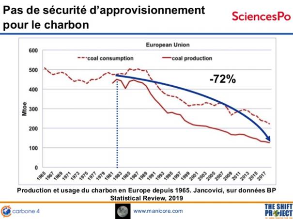 Rien à voir avec le climat en 1980, on se contrefoutait du problème climatique. Ça a juste à voir avec le fait que quand vous tapez dans vos mines, eh bien il y en a de moins en moins, et à un moment il y en a de moins en moins comme disait Coluche. Et vous voyez également que les importations de charbon c'est un terme qui en valeur absolue, est quasiment constant. C'est-à-dire que vous ne compensez pas un déclin national par des importations un pour un.