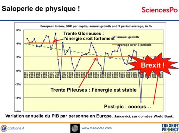 Alors ce que je viens de vous dire se traduit, voilà, dans le PIB par personne en Europe, donc vous avez les trente glorieuses, pendant lequel ça augmente de, allez, cinq, six pourcents par personne et par an, là c'est "Rhââ Lovely", comme chez Gottlieb, ensuite vous avez les trente piteuses, vous n'avez plus d'augmentation de l'énergie par personne mais vous avez deux termes qui vont faire augmenter le PIB.
