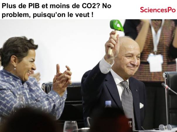 Alors moi je vous pose une question: quand vous avez en physique une expérience dont vous voyez que le résultat est indépendant de la valeur d'une variable, vous en tirez comme conclusion que cette variable n'intervient pas dans le résultat de l'expérience. Donc j'en tire une conclusion qui est que ce que la presse dit sur une COP, est indépendant de ce qui se passe. Ça n'a aucune espèce d'importance, ce que la presse dit sur une COP. Copenhague j'y étais, j'y étais pendant les quinze jours, je peux vous dire que c'est tout sauf un échec, par rapport aux autres COP, les deux degrés datent de Copenhague. Ce n'est pas à Paris que les deux degrés ont été entérinés, c'est à Copenhague. Voilà. C'est parce que Monsieur Jadot et consort se sont pavanés devant les caméras en disant que c'est un échec parce qu'ils étaient vexés comme des poux de ne pas avoir été associés à la décision, c'est à peu près comme ça que ça s'est passé, que la presse a retenu que c'était un échec. Mais ce n'était pas du tout un échec. Donc le..., enfin, encore une fois, relativement aux autres. Après ce sont toutes des échecs puisque ça augmente tout le temps.