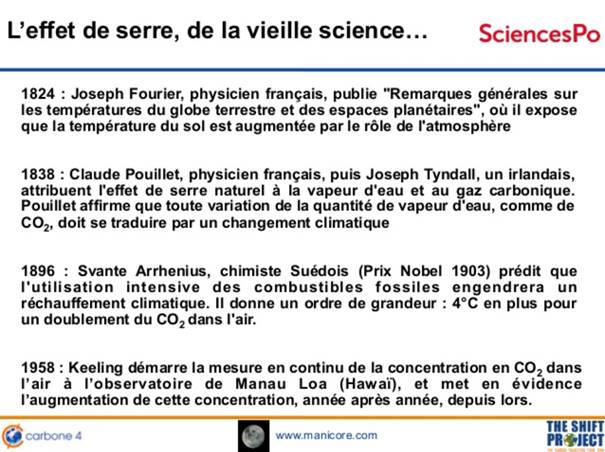 Ce que je vais vous montrer maintenant dans les cinq minutes qui me restent parce qu'on me fait la grosse tête, enfin les gros yeux, c'est quelques éléments, je laisserai la présentation..., d'abord il faut savoir que l'effet de serre c'est un truc qui est connu depuis deux siècles. Donc ce n'est pas de la science qui date d'hier, l'effet de serre, c'est connu depuis deux siècles. Ça fait plus d'un siècle qu'on sait ce qui se passe quand on fait, quand on double la quantité de CO2 dans l'air. Donc en gros on connaît très bien le dossier scientifique depuis très longtemps. Les gens qui disent tout ça c'est des conneries sont tous des imposteurs.