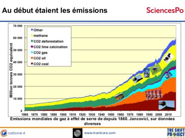 Alors, la cause du changement climatique c'est pour partie la cause de l'utilisation de l'énergie, c'est qu'on émet du CO2 à cause du pétrole, du gaz, du charbon, on émet du CO2 à cause de la déforestation, on coupe des forêts, en ce moment ça brûle en Amazonie vous le savez, on émet d'autres gaz à effet de serre parce qu'un gaz à effet de serre c'est juste un gaz qui intercepte les infrarouges terrestres il y a plusieurs gaz qui correspondent à cette définition, on émet du méthane avec nos activités agricoles et énergies fossile et enfin on émet etc.