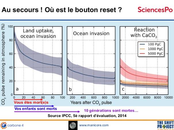 Donc ce que je suis en train de vous dire c'est que le processus est fondamentalement irréversible, il n'y a pas de bouton "reset" et ce n'est pas comme dans "Game of thrones" si vous avez raté la troisième série vous y revenez en replay, là ce n'est pas possible vous n'avez aucune possibilité, c'est comme le vieillissement d'un organisme vous n'avez aucune possibilité de revenir en arrière. Aucune. Dit autrement c'est une expérience qu'on ne fera qu'une fois, et à cause de l'inertie du CO2 dans l'air, si à un moment quelconque on considère que le résultat de l'expérience nous déplaît, la seule certitude que nous avons à ce moment-là c'est que c'est pire derrière. J'insiste. La seule certitude que nous avons à ce moment-là c'est que c'est pire derrière! D'accord?
