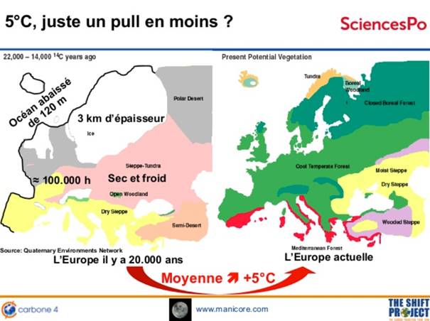 Vous voyez que les écosystèmes qu'on trouve en France ressemblent à ceux qu'on a aujourd'hui au nord de la Sibérie, et la population humaine en France à cette époque ne fait même pas la population de la totalité des grandes écoles françaises c'est dire! Eh bien la différence de température que vous avez entre, planétaire, la différence de température planétaire, que vous avez entre le paysage de gauche et le paysage de droite c'est juste 5 degrés de réchauffement.
